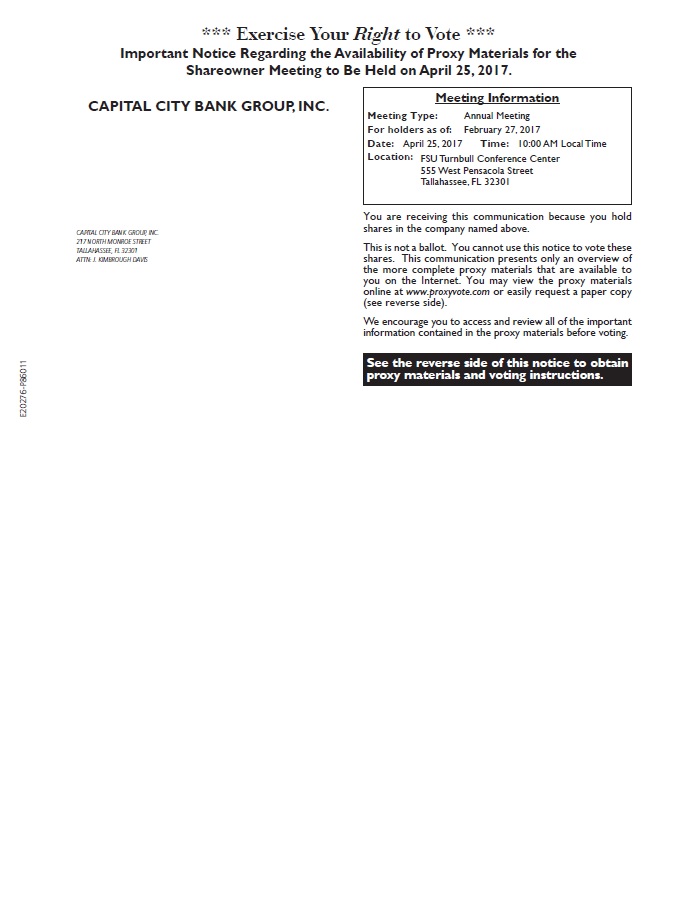 *** Exercise Your Right to Vote ***Important Notice Regarding the Availability of Proxy Materials for theShareowner Meeting to Be Held on April 25, 2017. Meeting InformationCAPITAL CITY BANK GROUP, INC.Meeting Type: Annual Meeting For holders as of: February 27, 2017Date: April 25, 2017 Time: 10:00 AM Local Time Location:FSU Turnbull Conference Center555 West Pensacola StreetTallahassee, FL 32301You are receiving this communication because you hold shares in the company named above. This is not a ballot. You cannot use this notice to vote these shares. This communication presents only an overview of the more complete proxy materials that are available to you on the Internet. You may view the proxy materials online at www.proxyvote.com or easily request a paper copy (see reverse side). We encourage you to access and review all of the important information contained in the proxy materials before voting.CAPITAL CITY BANK GROUP, INC.217 NORTH MONROE STREETTALLAHASSEE, FL 32301ATTN: J. KIMBROUGH DAVISE20276-P86011See the reverse side of this notice to obtain proxy materials and voting instructions.