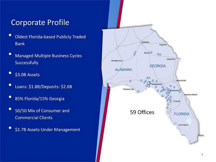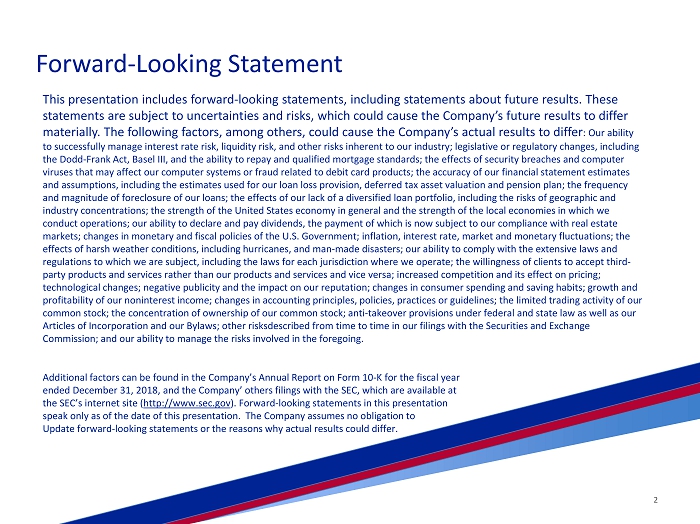 Forward - Looking Statement 2 This presentation includes forward - looking statements, including statements about future results. These statements are subject to uncertainties and risks, which could cause the Company’s future results to differ materially. The following factors, among others, could cause the Company’s actual results to differ : Our ability to successfully manage interest rate risk, liquidity risk, and other risks inherent to our industry; legislative or regulator y c hanges, including the Dodd - Frank Act, Basel III, and the ability to repay and qualified mortgage standards; the effects of security breaches and c omputer viruses that may affect our computer systems or fraud related to debit card products; the accuracy of our financial statement es timates and assumptions, including the estimates used for our loan loss provision, deferred tax asset valuation and pension plan; the fr equency and magnitude of foreclosure of our loans; the effects of our lack of a diversified loan portfolio, including the risks of ge ogr aphic and industry concentrations; the strength of the United States economy in general and the strength of the local economies in whic h w e conduct operations; our ability to declare and pay dividends, the payment of which is now subject to our compliance with real es tate markets; changes in monetary and fiscal policies of the U.S. Government; inflation, interest rate, market and monetary fluctu ati ons; the effects of harsh weather conditions, including hurricanes, and man - made disasters; our ability to comply with the extensive laws and regulations to which we are subject, including the laws for each jurisdiction where we operate; the willingness of clients to ac cept third - party products and services rather than our products and services and vice versa; increased competition and its effect on pri cin g; technological changes; negative publicity and the impact on our reputation; changes in consumer spending and saving habits; g row th and profitability of our noninterest income; changes in accounting principles, policies, practices or guidelines; the limited tra din g activity of our common stock; the concentration of ownership of our common stock; anti - takeover provisions under federal and state law as well a s our Articles of Incorporation and our Bylaws; other risksdescribed from time to time in our filings with the Securities and Exchange Commission; and our ability to manage the risks involved in the foregoing. Additional factors can be found in the Company’s Annual Report on Form 10 - K for the fiscal year ended December 31, 2018, and the Company ’ others filings with the SEC, which are available at the SEC’s internet site ( http://www.sec.gov ). Forward - looking statements in this presentation speak only as of the date of this presentation. The Company assumes no obligation to Update forward - looking statements or the reasons why actual results could differ.