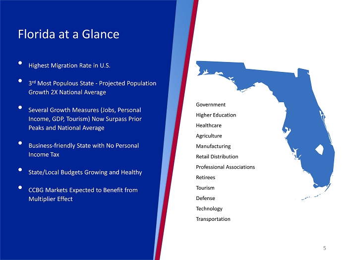Market Cap (1) $366 Million 25 Years 60/40 Experienced Management Average of 25 Years’ Experience with CCBG Ownership ~60% Retail/40% Institutional ~ 24% Insider $ 366 M Corporate Profile 4 ( 1) As of 03/31/19