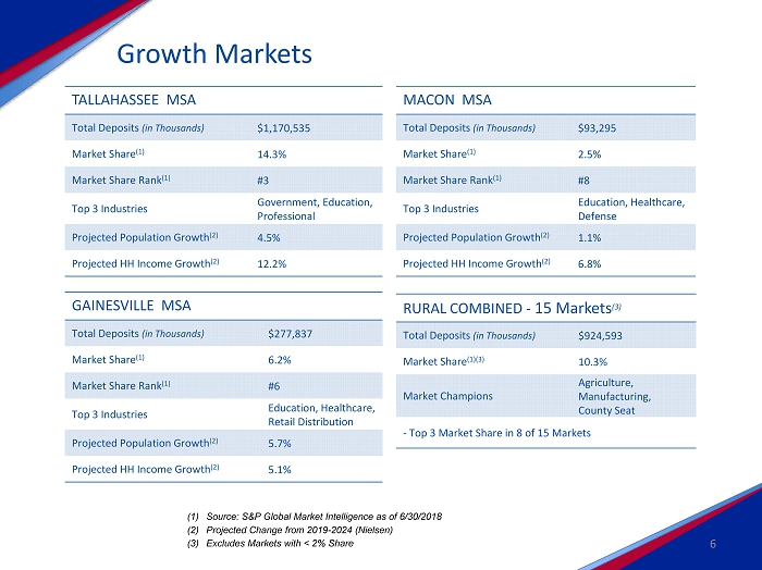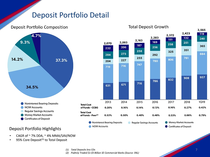 Growth Markets TALLAHASSEE MSA Total Deposits (in Thousands) $1,170,535 Market Share (1) 14.3% Market Share Rank (1) #3 Top 3 Industries Government, Education, Professional Projected Population Growth (2) 4.5% Projected HH Income Growth (2) 12.2% GAINESVILLE MSA Total Deposits (in Thousands) $277,837 Market Share (1) 6.2% Market Share Rank (1) #6 Top 3 Industries Education, Healthcare, Retail Distribution Projected Population Growth (2) 5.7% Projected HH Income Growth (2) 5.1% MACON MSA Total Deposits (in Thousands) $93,295 Market Share (1) 2.5% Market Share Rank (1) #8 Top 3 Industries Education, Healthcare, Defense Projected Population Growth (2) 1.1% Projected HH Income Growth (2) 6.8% RURAL COMBINED - 15 Markets (3) Total Deposits (in Thousands) $924,593 Market Share (1)(3) 10.3% Market Champions Agriculture, Manufacturing, County Seat - Top 3 Market Share in 8 of 15 Markets 6 (1) Source: S&P Global Market Intelligence as of 6/30/2018 (2) Projected Change from 2019 - 2024 (Nielsen) (3) Excludes Markets with < 2% Share