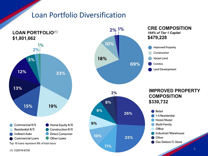Deposit Portfolio Detail Deposit Portfolio Composition Total Deposit Growth Deposit Portfolio Highlights (1) Total Deposits less CDs (2) Publicly Traded $1 - $5 Billion SE Commercial Banks (Source: SNL) • CAGR of ~ 7% DDA, ~ 4% MMA/SAV/ NOW • 95% Core Deposit (1) to Total Deposit 7