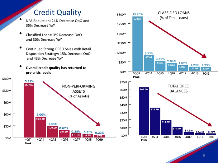 Loan Portfolio Diversification CRE COMPOSITION 164% of Tier 1 Capital $479,228 8 (1 ) 1Q2019 - EOM IMPROVED PROPERTY COMPOSITION $330,732 LOAN PORTFOLIO (1) $1,801,662 Top 10 loans represent 6% of total loans
