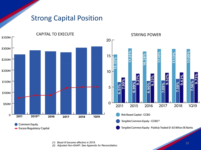 Credit Quality NON - PERFORMING ASSETS (% of Assets) CLASSIFIED LOANS (% of Total Loans) TOTAL OREO BALANCES • NPA Reduction: 24% Decrease QoQ and 35% Decrease YoY • Classified Loans: 3% De c rease QoQ and 30% Decrease YoY • Continued Strong OREO Sales with Retail Disposition Strategy: 15 % Decrease QoQ and 43% Decrease YoY • Overall credit quality has returned to pre - crisis levels 9
