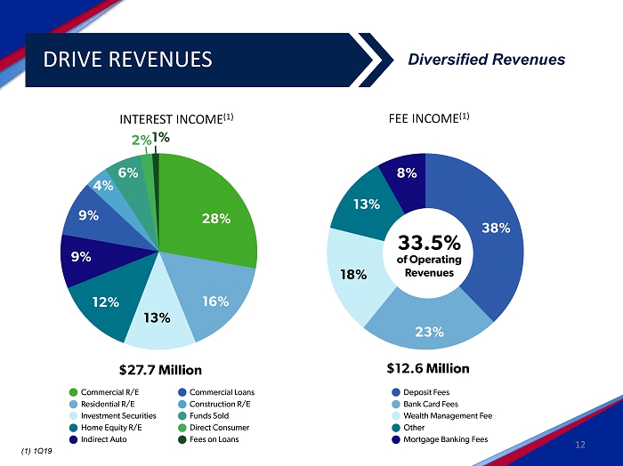 DRIVE REVENUES INTEREST INCOME (1) FEE INCOME (1) 12 ( 1) 1Q19 Diversified Revenues