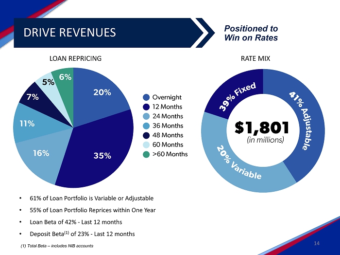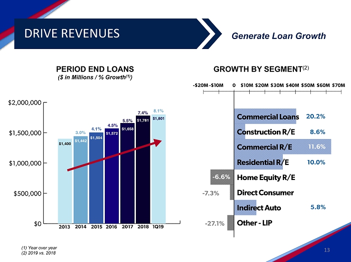 PERIOD END LOANS ($ in Millions / % Growth (1) ) GROWTH BY SEGMENT (2) 13 (1) Year over year ( 2 ) 2019 vs. 2018 DRIVE REVENUES Generate Loan Growth