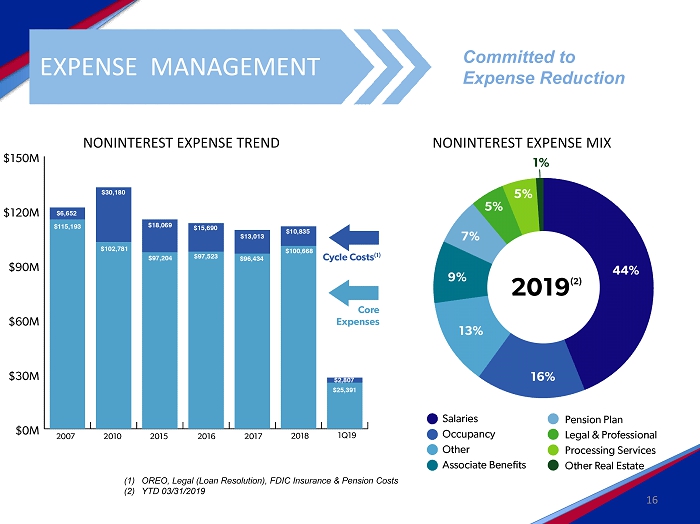 NONINTEREST EXPENSE TREND NONINTEREST EXPENSE MIX 16 (1) OREO, Legal (Loan Resolution), FDIC Insurance & Pension Costs (2) YTD 03/31/2019 EXPENSE MANAGEMENT Committed to Expense Reduction