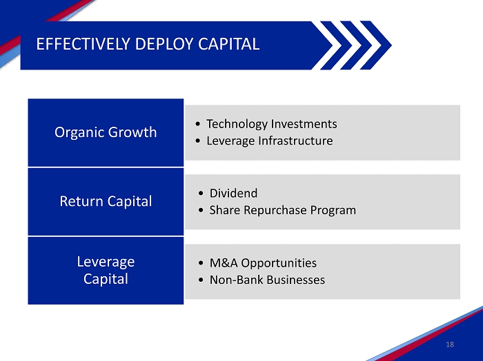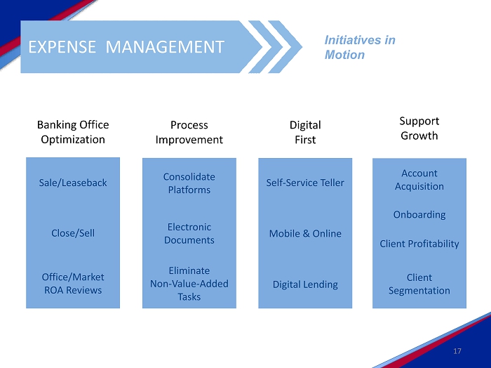 Support Growth Account Acquisition Onboarding Client Profitability Client Segmentation Digital First Self - Service Teller Mobile & Online Digital Lending Banking Office Optimization Sale/Leaseback Close/Sell Office/Market ROA Reviews Process Improvement Consolidate Platforms Electronic Documents Eliminate Non - Value - Added Tasks 17 Initiatives in Motion EXPENSE MANAGEMENT