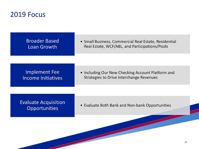 20 2019 Focus • Small Business, Commercial Real Estate, Residential Real Estate, WCF/ABL, and Participations/Pools Broader Based Loan Growth • Including Our New Checking Account Platform and Strategies to Drive Interchange Revenues Implement Fee Income Initiatives • Evaluate Both Bank and Non - bank Opportunities Evaluate Acquisition Opportunities