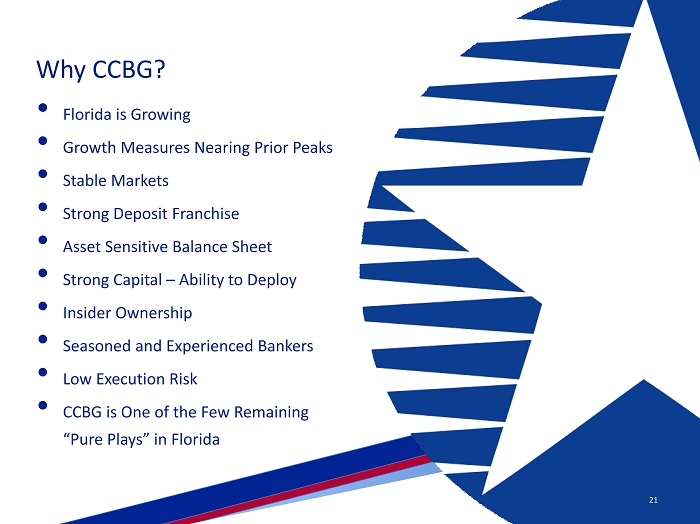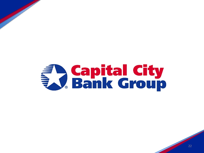 Why CCBG? • Florida is Growing • Growth Measures Nearing Prior Peaks • Stable Markets • Strong Deposit Franchise • Asset Sensitive Balance Sheet • Strong Capital – Ability to Deploy • Insider Ownership • Seasoned and Experienced Bankers • Low Execution Risk • CCBG is One of the Few Remaining “Pure Plays” in Florida 21