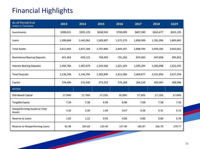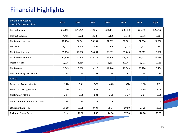 Financial Highlights Dollars in Thousands, except Earnings per Share 2013 2014 2015 2016 2017 2018 1Q19 Interest Income $82,152 $78,221 $79,658 $81,154 $86,930 $99,395 $27,722 Interest Expense 4,416 3,580 3,307 3,189 3,948 6,891 2,814 Net Interest Income 77,736 74,641 76,351 77,965 82,982 92,504 24,908 Provision 3,472 1,905 1,594 819 2,215 2,921 767 Noninterest Income 56,416 52,536 54,091 53,681 51,746 51,565 12,552 Noninterest Expense 122,710 114,358 115,273 113,214 109,447 111,503 28,198 Income Taxes 1,925 1,654 4,459 5,867 12,203 3,421 2,059 Net Income 6,045 9,260 9,116 11,746 10,863 26,224 6,436 Diluted Earnings Per Share .35 .53 .53 .69 .64 1.54 .38 RATIOS Return on Average Assets .24% .36% .34% .43% .39% .92% .87% Return on Average Equity 2.40 3.27 3.31 4.22 3.83 8.89 8.49 Net Interest Margin 3.54 3.36 3.31 3.25 3.37 3.64 3.75 Net Charge - offs to Average Loans .66 .53 .35 .09 .14 .12 .20 Efficiency Ratio (FTE) 91.09 89.68 87.94 85.34 80.50 77.05 75.01 Dividend Payout Ratio N/M 16.98 24.53 24.64 37.50 20.78 28.55 25