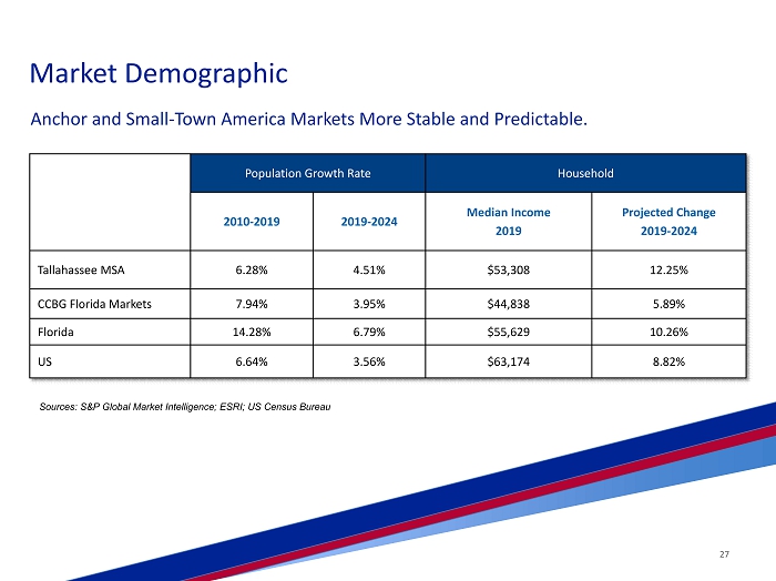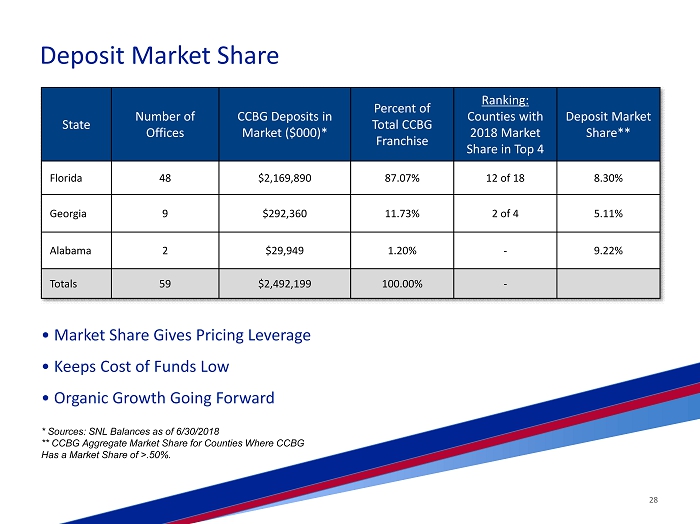 NASDAQ: CCBG Population Growth Rate Household 2010 - 2019 2019 - 2024 Median Income 2019 Projected Change 2019 - 2024 Tallahassee MSA 6.28% 4.51% $53,308 12.25% CCBG Florida Markets 7.94% 3.95% $44,838 5.89% Florida 14.28% 6.79% $55,629 10.26% US 6.64% 3.56% $63,174 8.82% Sources: S&P Global Market Intelligence; ESRI; US Census Bureau Anchor and Small - Town America Markets More Stable and Predictable. 27 Market Demographic