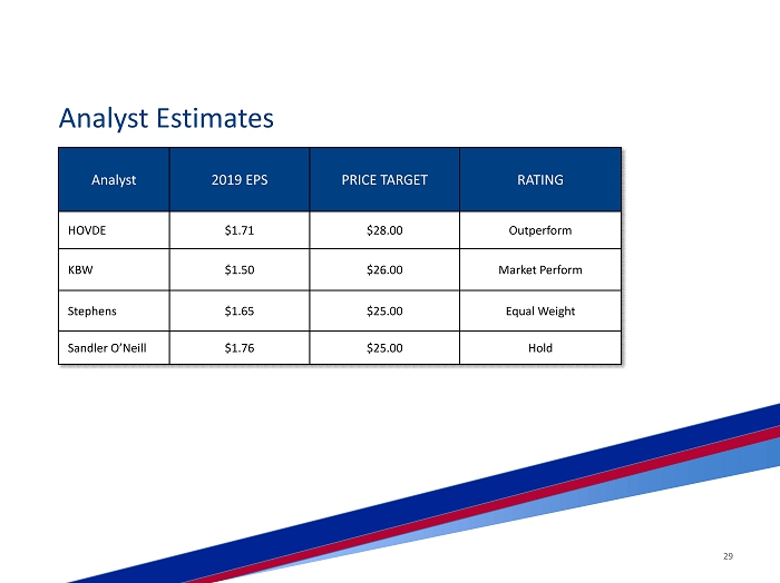 Analyst Estimates Analyst 2019 EPS PRICE TARGET RATING HOVDE $1.71 $28.00 Outperform KBW $1.50 $26.00 Market Perform Stephens $1.65 $25.00 Equal Weight Sandler O’Neill $1.76 $25.00 Hold 29