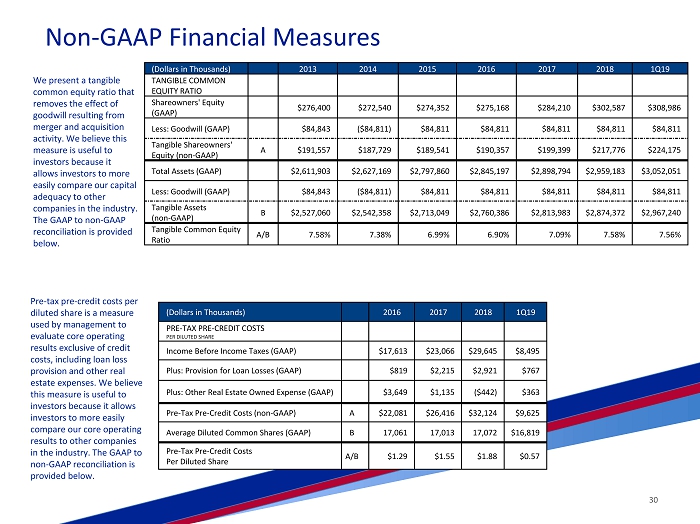 30 (Dollars in Thousands) 2013 2014 2015 2016 2017 2018 1Q19 TANGIBLE COMMON EQUITY RATIO Shareowners' Equity (GAAP) $ 276,400 $272,540 $ 274,352 $ 275,168 $ 284,210 $302,587 $308,986 Less: Goodwill (GAAP) $ 8 4,843 ($84,811) $84,811 $84,811 $84,811 $84,811 $84,811 Tangible Shareowners' Equity (non - GAAP) A $191,557 $187,729 $189,541 $190,357 $199,399 $ 217,776 $224,175 Total Assets (GAAP) $2,611,903 $2,627,169 $2,797,860 $2,845,197 $2,898,794 $ 2,959,183 $3,052,051 Less: Goodwill (GAAP) $ 8 4,843 ($84,811) $84,811 $84,811 $84,811 $ 84,811 $84,811 Tangible Assets ( non - GAAP) B $ 2,527,060 $2,542,358 $ 2,713,049 $ 2,760,386 $2,813,983 $ 2,874,372 $2,967,240 Tangible Common Equity Ratio A/B 7.58% 7.38% 6.99% 6.90% 7.09% 7.58% 7.56% (Dollars in Thousands) 2016 2017 2018 1Q19 PRE - TAX PRE - CREDIT COSTS PER DILUTED SHARE Income Before Income Taxes (GAAP) $ 17,613 $23,066 $29,645 $8,495 Plus: Provision for Loan Losses (GAAP) $819 $2,215 $2,921 $767 Plus: Other Real Estate Owned Expense (GAAP) $3,649 $1,135 ($442) $363 Pre - Tax Pre - Credit Costs (non - GAAP) A $22,081 $26,416 $32,124 $9,625 Average Diluted Common Shares (GAAP) B 17,061 17,013 17,072 $16,819 Pre - Tax Pre - Credit Costs Per Diluted Share A/B $ 1.29 $1.55 $1.88 $0.57 We present a tangible common equity ratio that removes the effect of goodwill resulting from merger and acquisition activity . We believe this measure is useful to investors because it allows investors to more easily compare our capital adequacy to other companies in the industry. The GAAP to non - GAAP reconciliation is provided below. Pre - tax pre - credit costs per diluted share is a measure used by management to evaluate core operating results exclusive of credit costs, including loan loss provision and other real estate expenses . We believe this measure is useful to investors because it allows investors to more easily compare our core operating results to other companies in the industry . The GAAP to non - GAAP reconciliation is provided below. Non - GAAP Financial Measures