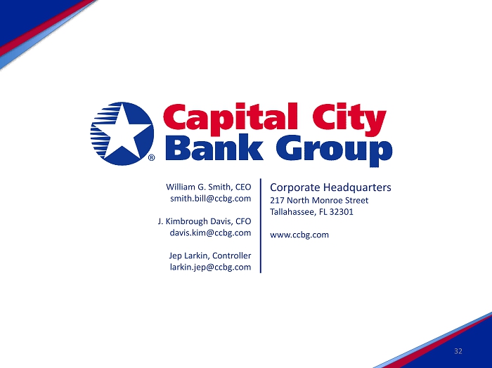 Corporate Headquarters 217 North Monroe Street Tallahassee, FL 32301 www.ccbg.com 32 William G. Smith, CEO smith.bill@ccbg.com J. Kimbrough Davis, CFO d avis.kim@ccbg.com Jep Larkin, Controller l arkin.jep@ccbg.com