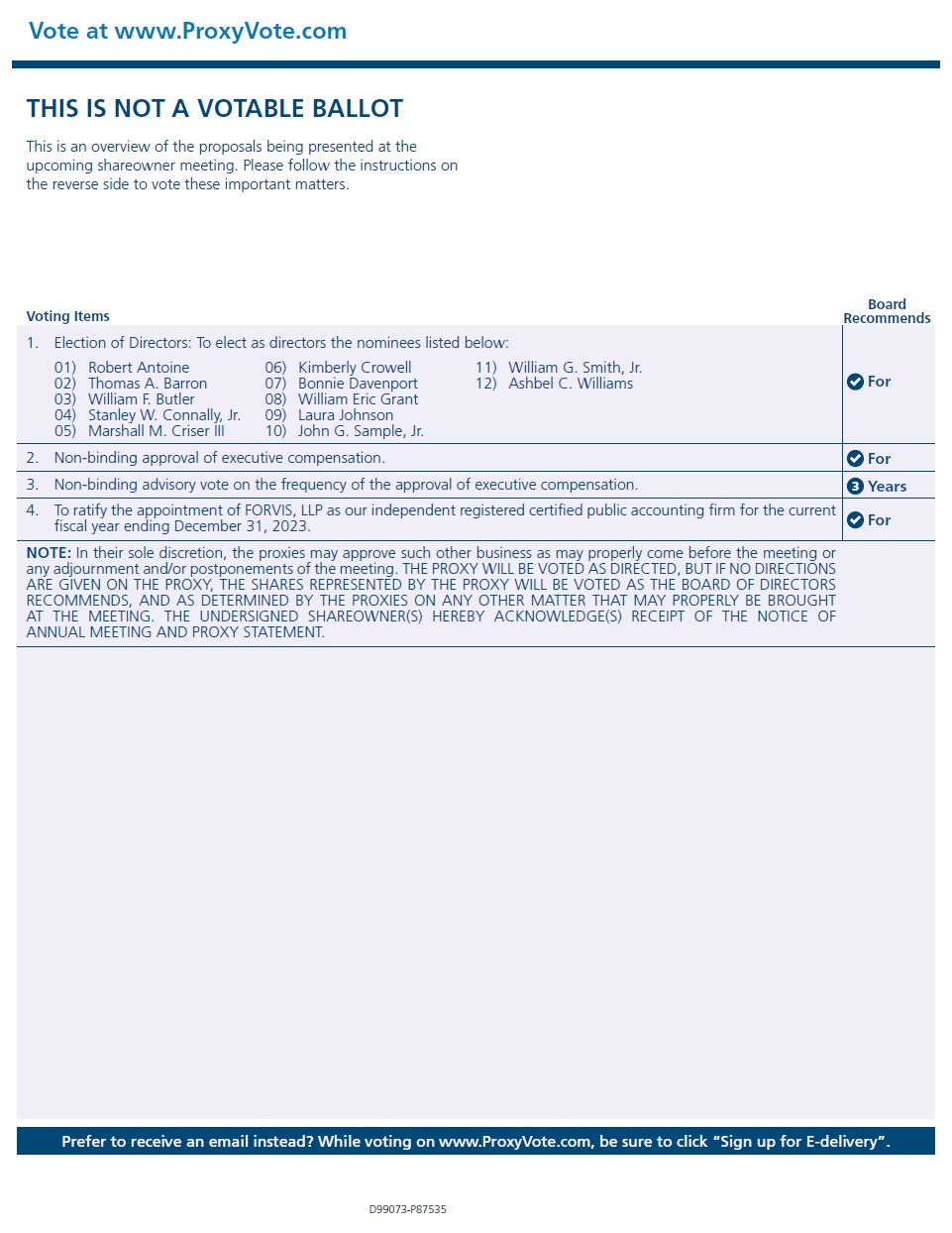 THIS IS NOT A VOTABLE BALLOT This is an overview of the proposals being presented at the upcoming shareowner meeting. Please follow the instructions on the reverse side to vote these important matters. Vote at www.ProxyVote.com Prefer to receive an email instead? While voting on www.ProxyVote.com, be sure to click “Sign up for E-delivery”. Voting Items Board Recommends D99073-P87535 3 Years 1. Election of Directors: To elect as directors the nominees listed below: 2. Non-binding approval of executive compensation. 3. Non-binding advisory vote on the frequency of the approval of executive compensation. 4. To ratify the appointment of FORVIS, LLP as our independent registered certified public accounting firm for the current fiscal year ending December 31, 2023. For For For 01) Robert Antoine 02) Thomas A. Barron 03) William F. Butler 04) Stanley W. Connally, Jr. 05) Marshall M. Criser III 06) Kimberly Crowell 07) Bonnie Davenport 08) William Eric Grant 09) Laura Johnson 10) John G. Sample, Jr. 11) William G. Smith, Jr. 12) Ashbel C. Williams NOTE: In their sole discretion, the proxies may approve such other business as may properly come before the meeting or any adjournment and/or postponements of the meeting. THE PROXY WILL BE VOTED AS DIRECTED, BUT IF NO DIRECTIONS ARE GIVEN ON THE PROXY, THE SHARES REPRESENTED BY THE PROXY WILL BE VOTED AS THE BOARD OF DIRECTORS RECOMMENDS, AND AS DETERMINED BY THE PROXIES ON ANY OTHER MATTER THAT MAY PROPERLY BE BROUGHT AT THE MEETING. THE UNDERSIGNED SHAREOWNER(S) HEREBY ACKNOWLEDGE(S) RECEIPT OF THE NOTICE OF ANNUAL MEETING AND PROXY STATEMENT.
