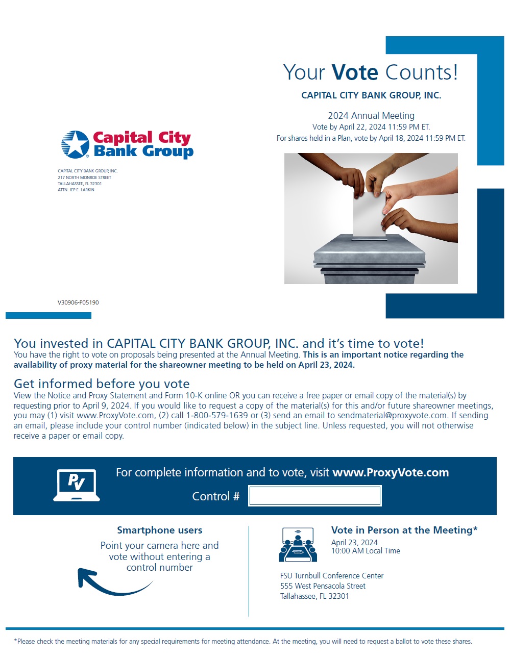 Your Vote Counts! Smartphone users Point your camera here and vote without entering a control number For complete information and to vote, visit www.ProxyVote.com Control # V30906-P05190 CAPITAL CITY BANK GROUP, INC. 217 NORTH MONROE STREET TALLAHASSEE, FL 32301 ATTN: JEP E. LARKIN CAPITAL CITY BANK GROUP, INC. You invested in CAPITAL CITY BANK GROUP, INC. and it’s time to vote! You have the right to vote on proposals being presented at the Annual Meeting. This is an important notice regarding the availability of proxy material for the shareowner meeting to be held on April 23, 2024. Get informed before you vote View the Notice and Proxy Statement and Form 10-K online OR you can receive a free paper or email copy of the material(s) by requesting prior to April 9, 2024. If you would like to request a copy of the material(s) for this and/or future shareowner meetings, you may (1) visit www.ProxyVote.com, (2) call 1-800-579-1639 or (3) send an email to sendmaterial@proxyvote.com. If sending an email, please include your control number (indicated below) in the subject line. Unless requested, you will not otherwise receive a paper or email copy. Vote in Person at the Meeting* April 23, 2024 10:00 AM Local Time FSU Turnbull Conference Center 555 West Pensacola Street Tallahassee, FL 32301 *Please check the meeting materials for any special requirements for meeting attendance. At the meeting, you will need to request a ballot to vote these shares. 2024 Annual Meeting Vote by April 22, 2024 11:59 PM ET. For shares held in a Plan, vote by April 18, 2024 11:59 PM ET.