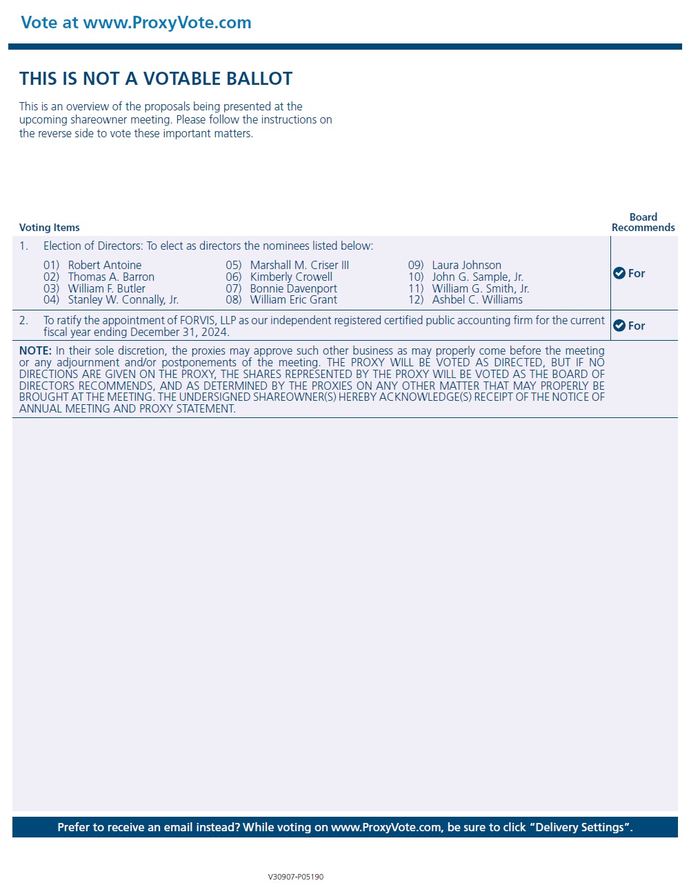 Vote at www.ProxyVote.com Prefer to receive an email instead? While voting on www.ProxyVote.com, be sure to click “Delivery Settings”. V30907-P05190 Voting Items Board Recommends THIS IS NOT A VOTABLE BALLOT This is an overview of the proposals being presented at the upcoming shareowner meeting. Please follow the instructions on the reverse side to vote these important matters. 1. Election of Directors: To elect as directors the nominees listed below: For 01) Robert Antoine 02) Thomas A. Barron 03) William F. Butler 04) Stanley W. Connally, Jr. 05) Marshall M. Criser III 06) Kimberly Crowell 07) Bonnie Davenport 08) William Eric Grant 09) Laura Johnson 10) John G. Sample, Jr. 11) William G. Smith, Jr. 12) Ashbel C. Williams 2. To ratify the appointment of FORVIS, LLP as our independent registered certified public accounting firm for the current fiscal year ending December 31, 2024. For NOTE: In their sole discretion, the proxies may approve such other business as may properly come before the meeting or any adjournment and/or postponements of the meeting. THE PROXY WILL BE VOTED AS DIRECTED, BUT IF NO DIRECTIONS ARE GIVEN ON THE PROXY, THE SHARES REPRESENTED BY THE PROXY WILL BE VOTED AS THE BOARD OF DIRECTORS RECOMMENDS, AND AS DETERMINED BY THE PROXIES ON ANY OTHER MATTER THAT MAY PROPERLY BE BROUGHT AT THE MEETING. THE UNDERSIGNED SHAREOWNER(S) HEREBY ACKNOWLEDGE(S) RECEIPT OF THE NOTICE OF ANNUAL MEETING AND PROXY STATEMENT.