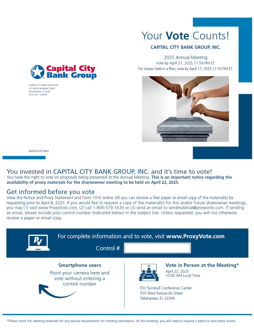 Your Vote Counts! *Please check the meeting materials for any special requirements for meeting attendance. At the meeting, you will need to request a ballot to vote these shares. Smartphone users Point your camera here and vote without entering a control number For complete information and to vote, visit www.ProxyVote.com Control # V62470-P25961 CAPITAL CITY BANK GROUP, INC. 217 NORTH MONROE STREET TALLAHASSEE, FL 32301 ATTN: JEP E. LARKIN CAPITAL CITY BANK GROUP, INC. 2025 Annual Meeting Vote by April 21, 2025 11:59 PM ET. For shares held in a Plan, vote by April 17, 2025 11:59 PM ET. You invested in CAPITAL CITY BANK GROUP, INC. and it’s time to vote! You have the right to vote on proposals being presented at the Annual Meeting. This is an important notice regarding the availability of proxy materials for the shareowner meeting to be held on April 22, 2025. Get informed before you vote View the Notice and Proxy Statement and Form 10-K online OR you can receive a free paper or email copy of the material(s) by requesting prior to April 8, 2025. If you would like to request a copy of the material(s) for this and/or future shareowner meetings, you may (1) visit www.ProxyVote.com, (2) call 1-800-579-1639 or (3) send an email to sendmaterial@proxyvote.com. If sending an email, please include your control number (indicated below) in the subject line. Unless requested, you will not otherwise receive a paper or email copy. Vote in Person at the Meeting* April 22, 2025 10:00 AM Local Time FSU Turnbull Conference Center 555 West Pensacola Street Tallahassee, FL 32306.